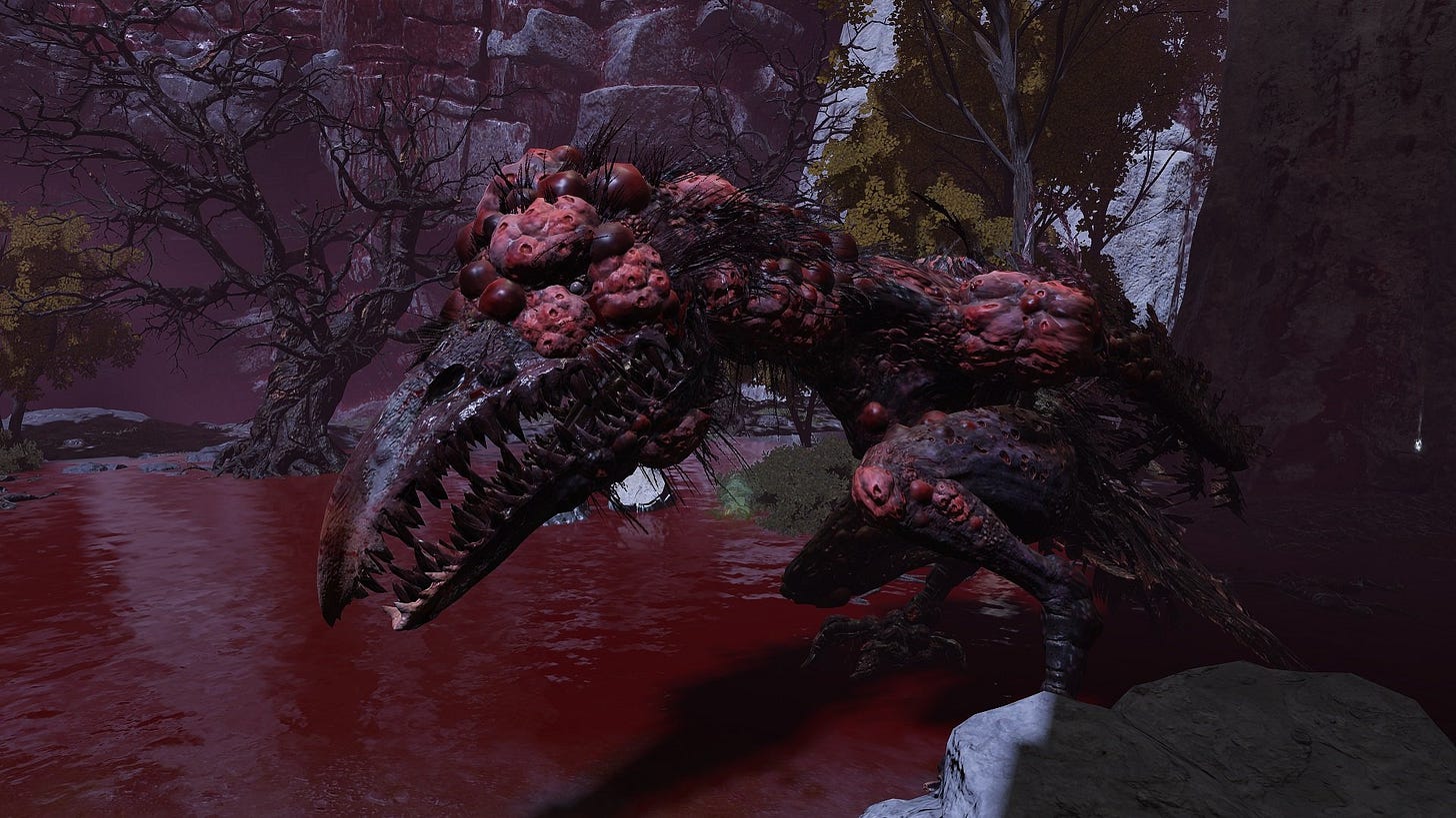 So, I’ve been thinking about quiet characters. Lots of video games have “silent protagonists,” from Link from the Legend of Zelda games to Gordon from Half Life. Plenty more have their speech represented by text, even when other characters are voiced. But I’m more interested in the ways that these characters aren’t exactly silent. Link screams when he falls into a bottomless void; Gordon wordlessly protests when you make him stand in flames. Lots of games now let you choose your character’s voice along with their physiology, which is especially funny in games like Elden Ring where your character doesn’t speak. What sound should Poisson—my ghoulishly pale and gaunt Elden Ring character—make when he gets eaten alive by bepustuled crow the size of a crop duster?